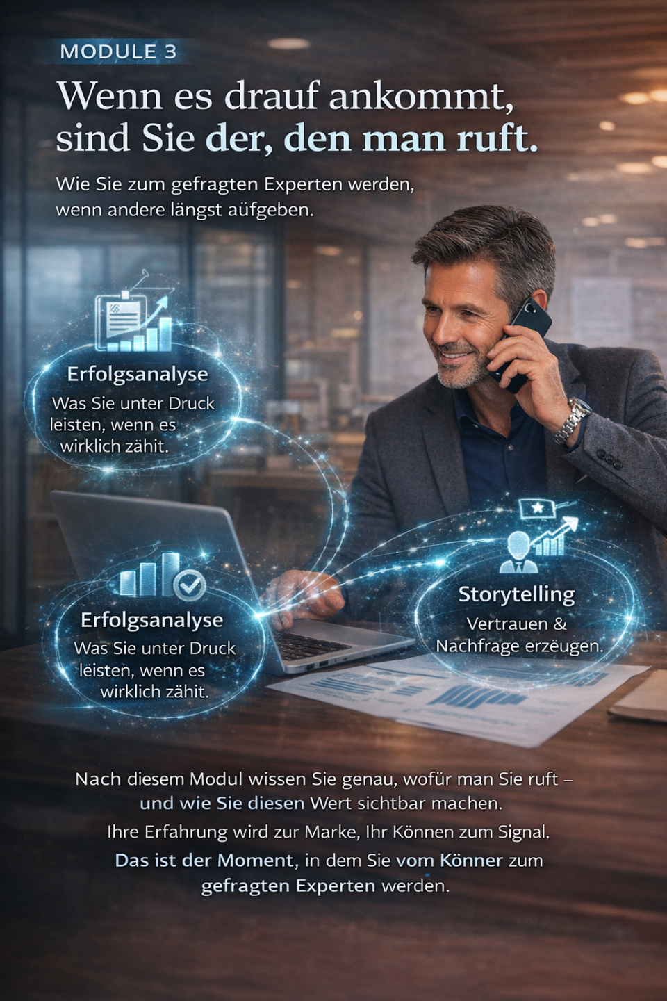 Im dritten Modul aktivieren Sie Ihre Freitag-Nachmittag-Kompetenz – jene Fähigkeit, Probleme zu lösen, wenn andere längst aufgeben. Sie lernen, Ihre souveränsten Momente in Worte zu fassen und daraus Ihren Expertenstatus zu formen – inklusive: