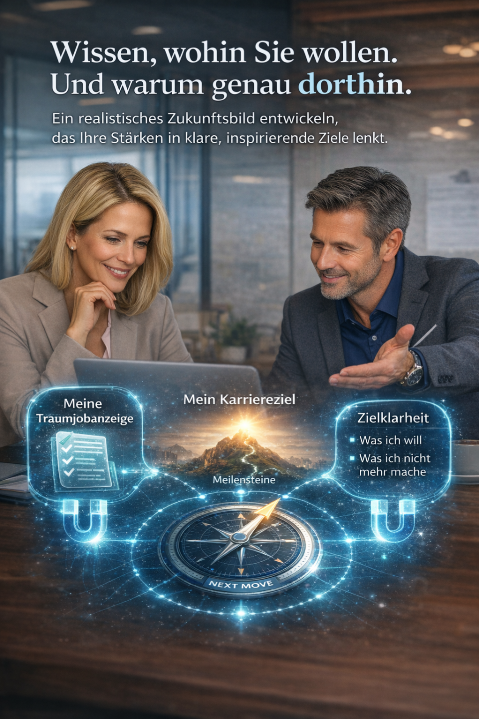 Im zweiten Modul definieren Sie Ihr berufliches Zielbild – nicht als Wunsch, sondern als klare Richtung. Sie entwickeln ein realistisches, inspirierendes Zukunftsszenario, das zeigt, wohin Ihre Stärken führen, wenn sie gezielt eingesetzt werden – einschließlich: