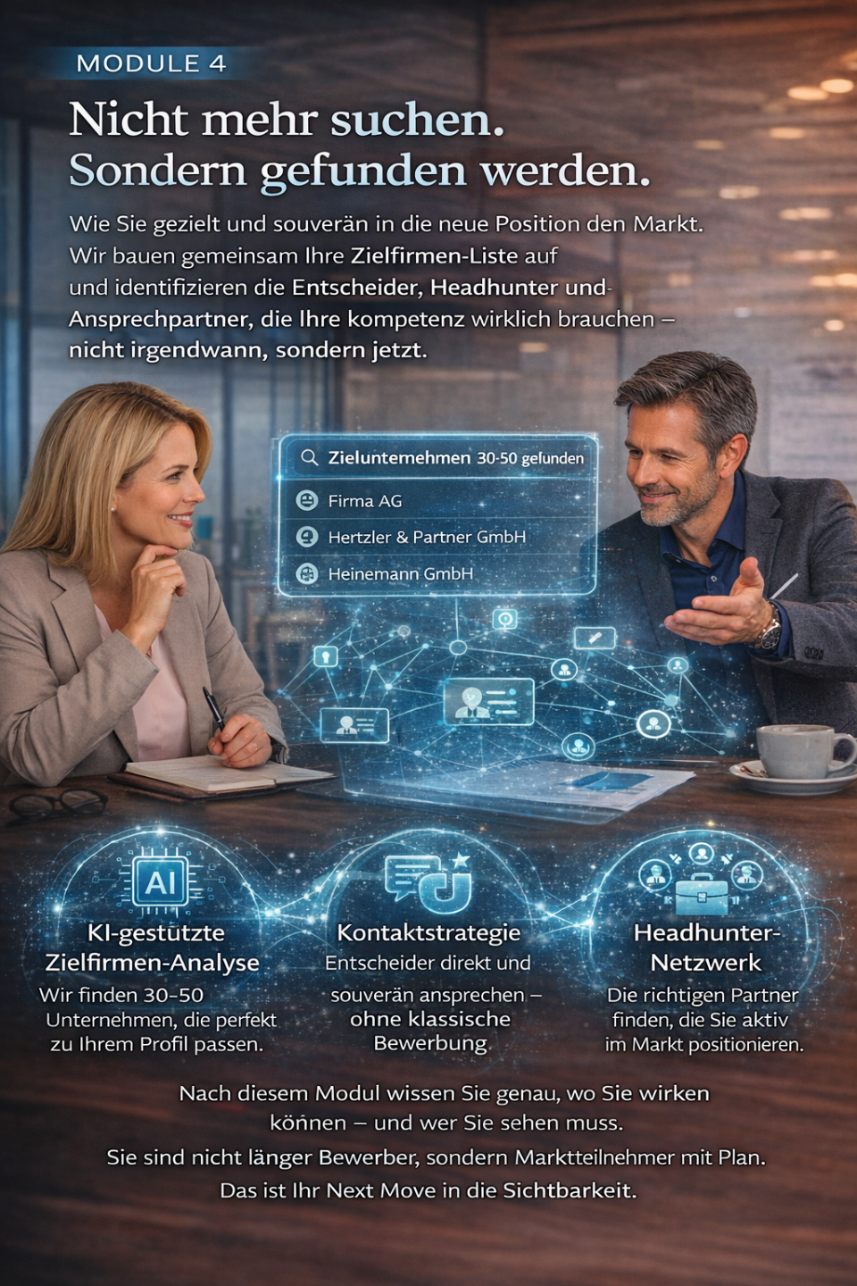 Im vierten Modul bringen Sie Ihre neue Klarheit in den Markt. Wir bauen gemeinsam Ihre Zielfirmen-Liste auf und identifizieren die Entscheider, Headhunter und Ansprechpartner, die Ihre Kompetenz wirklich brauchen – nicht irgendwann, sondern jetzt. Dieses Modul ist Ihr Sprung von der Theorie in die gezielte Umsetzung – einschließlich: